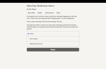 Talon City: Death from Above é um jogo de RPG envolvente disponível para Mac, onde os jogadores assumem o papel de um inteligente advogado coruja em busca de um cliente desaparecido. Neste mundo intrigante, os jogadores enfrentam uma série de inimigos e desafios, enquanto exploram ambientes ricos e cheios de mistérios. A narrativa instigante mantém os jogadores imersos, enquanto a jogabilidade estratégica exige astúcia e planejamento para superar os obstáculos.